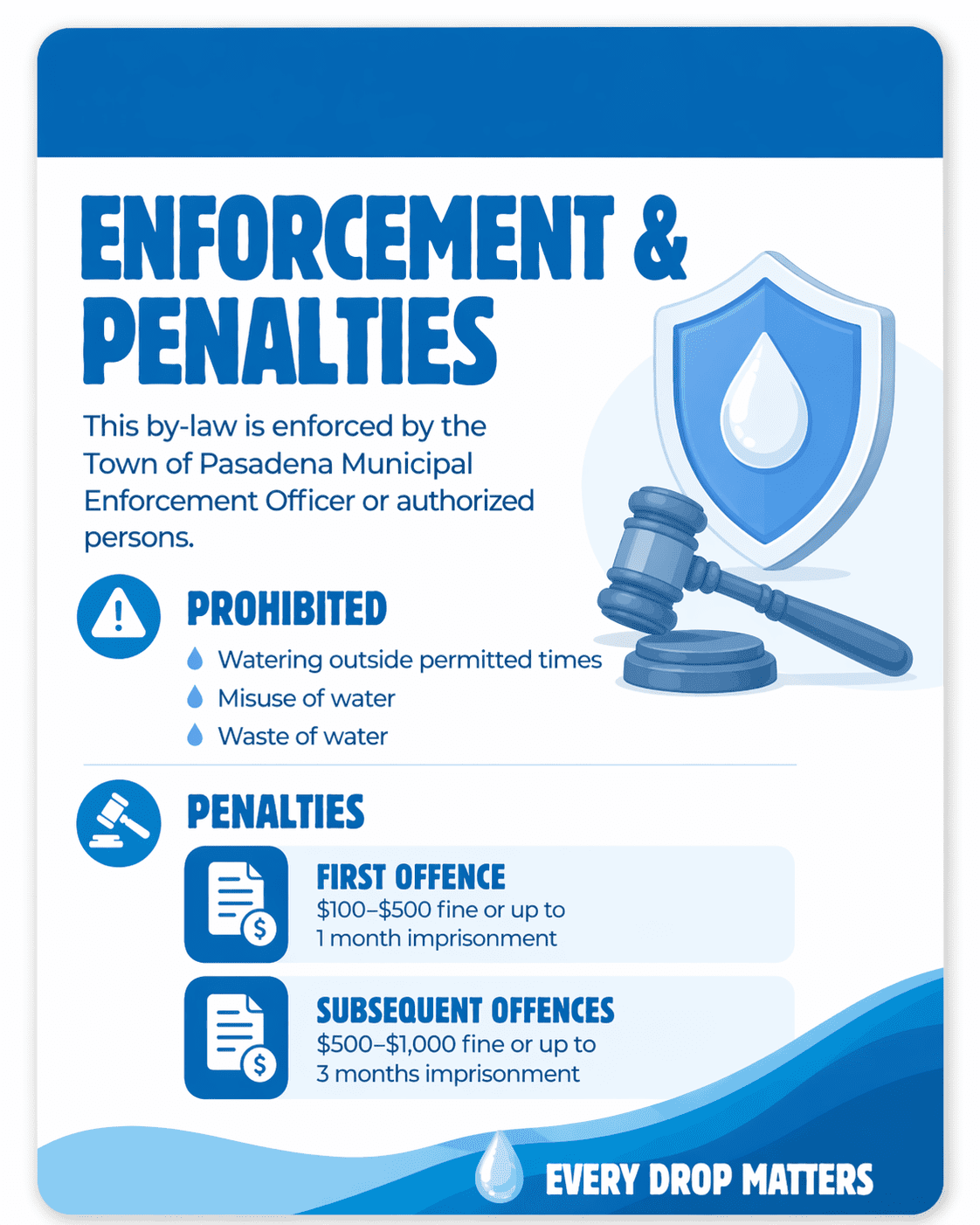 The Town of Pasadena has adopted a Water Conservation By-Law to help promote responsible water use and protect our municipal water supply and infrastructure.