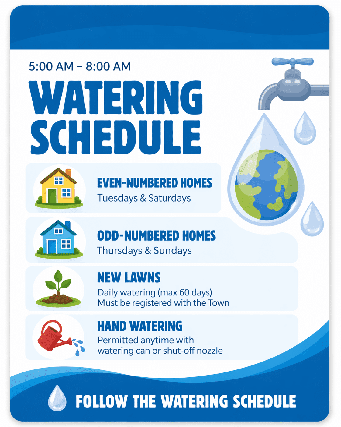 New lawns: Daily for up to 60 days, but must be registered with the Town.